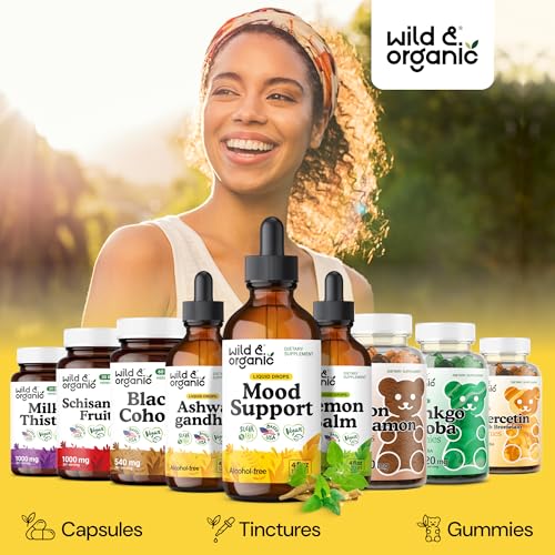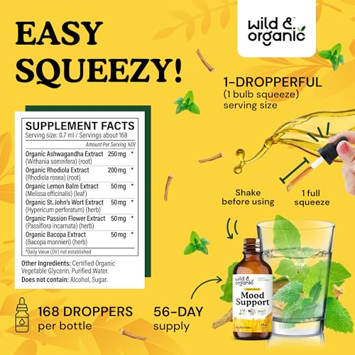 Wild & Organic Mood Support Supplement – Natural Liquid Drops for Positive Energy – Calm Mind Supplement for Women and Men – Non-Alcohol Ashwagandha & Rhodiola Rosea Root Tincture for Good Mood – 4 oz