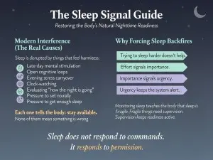Instead of promoting routines, optimization strategies, or willpower-based solutions, this guide focuses on how internal biological signaling governs your ability to rest—and how common behaviors unintentionally disrupt that signal.